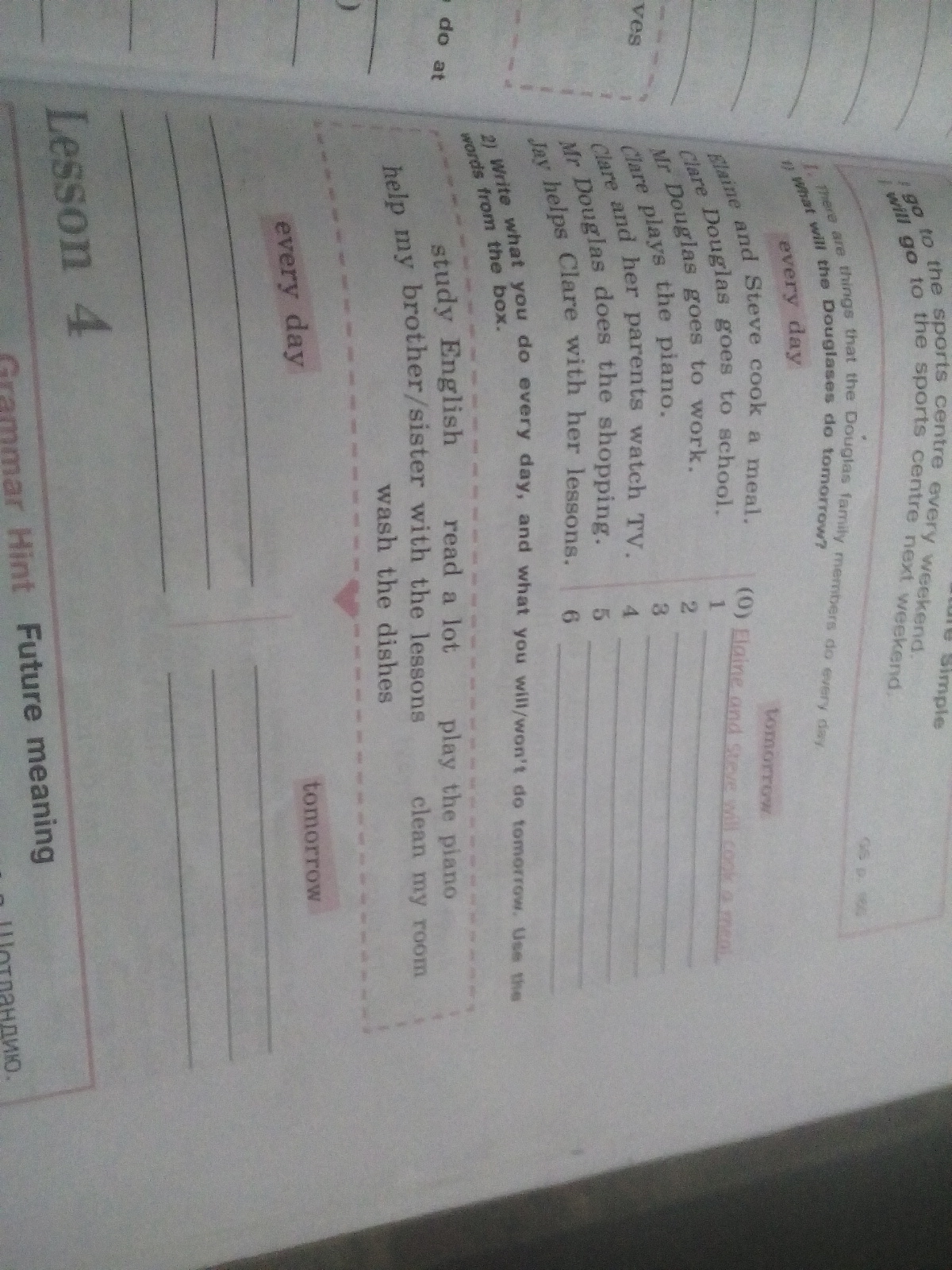 4)Clare and her parents will watch TV.