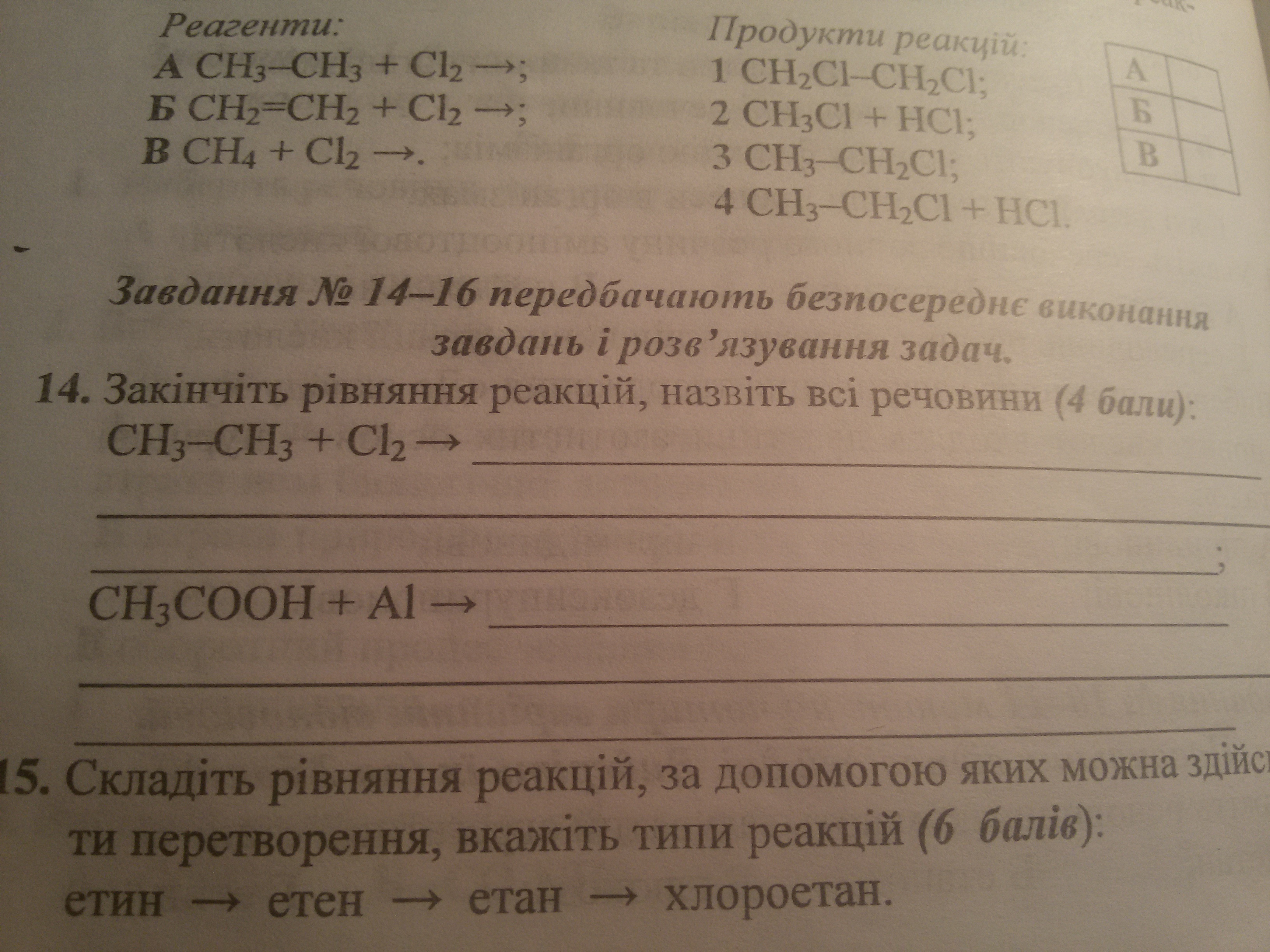 1) СН2(Cl)-CH3 + HCl ( реагирует этан с хлором,получается хлорэтан и соляная кислота)