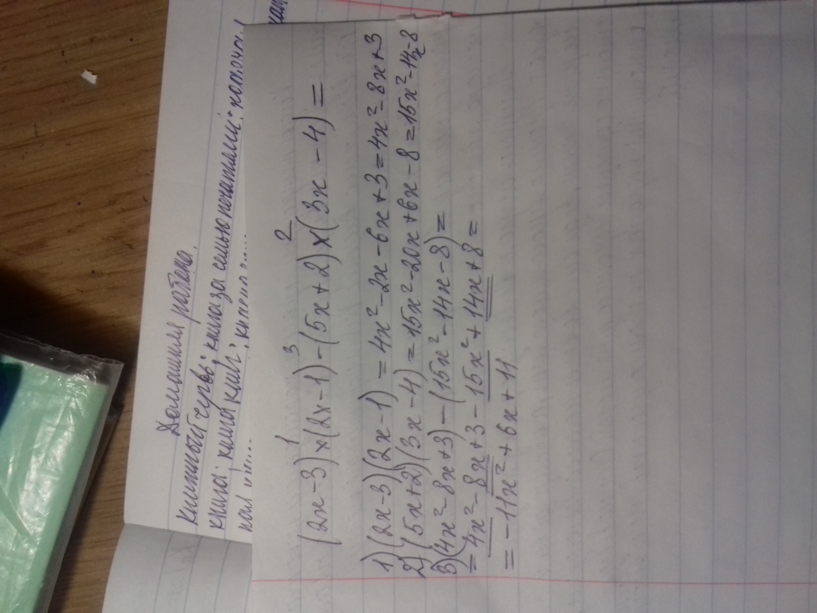 4х(в кв)-2х-6х+3-(15х(в кв)-20х+6х-8) = 4х(в кв)-8х+3-15х(в кв)+14х+8 =