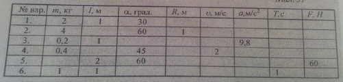 Шарик массой m привязана к нити длиной l и вращается в горизонтальной плоскости так, что нить образует с вертикалью угол альфа (рис.37). По окружности радиуса R шарик движется со скоростью v и центростремительным ускорением a так, что ее период обращения T. Сила натяжения нити во время такого движения F. Используя числовые данные, приведенные в таблице, определите значения неизвестных величин в варианте, указанном учителем.