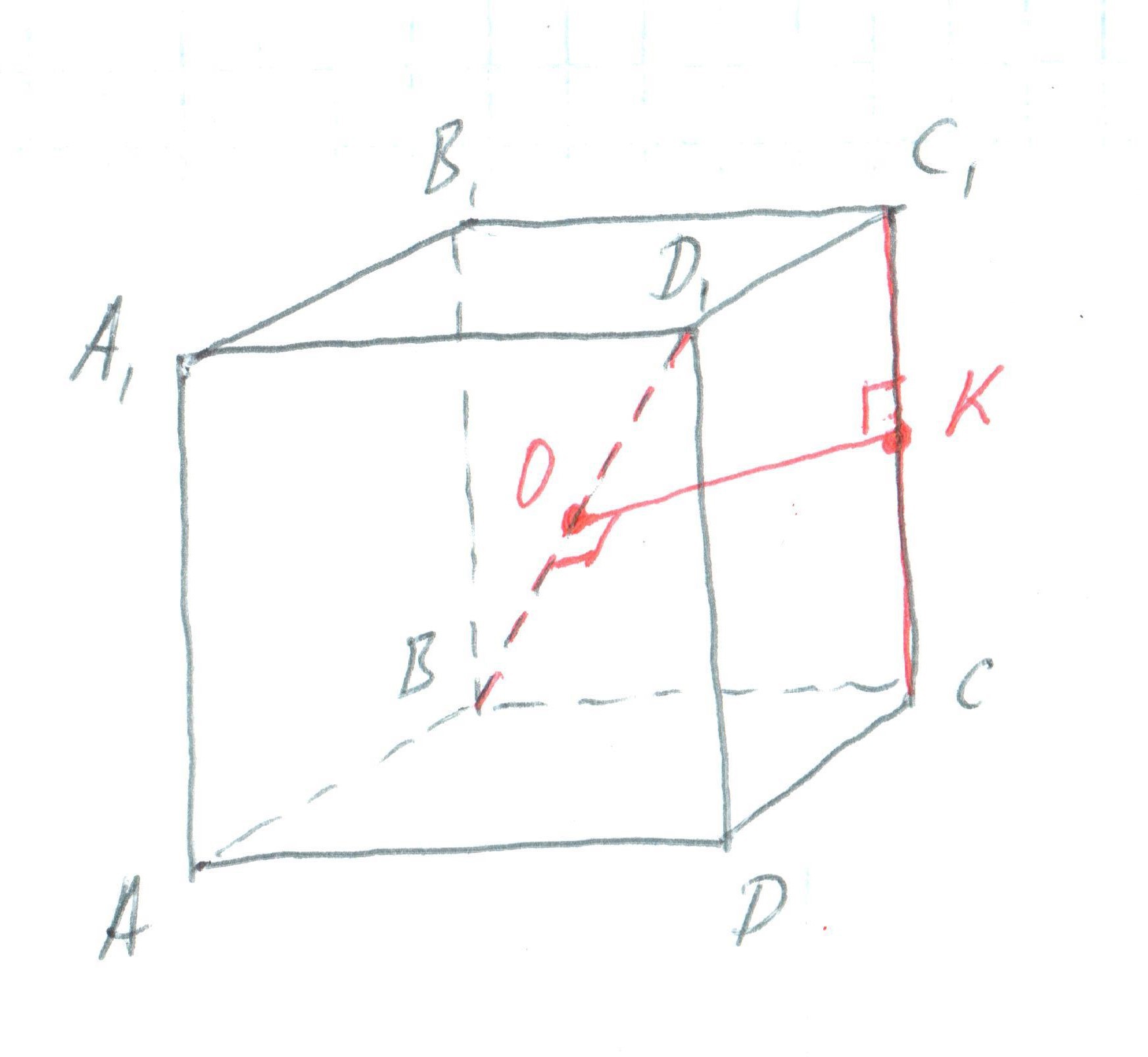 Расстояние между скрещивающимися прямыми есть длина перпендикуляра (OK). OK = половине диагонали основания (или любой грани - как Вам угодно). Т. к. грань - квадрат, то диагональ = a√2.