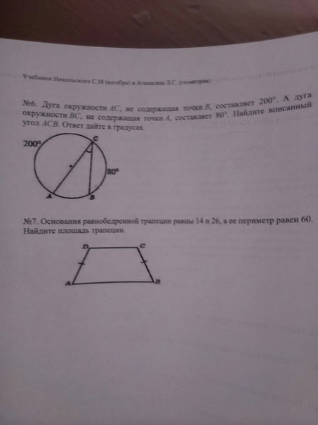 6) Так как дуга АС=200, а дуга СВ=80, то дуга АВ=360-(200+80)=80