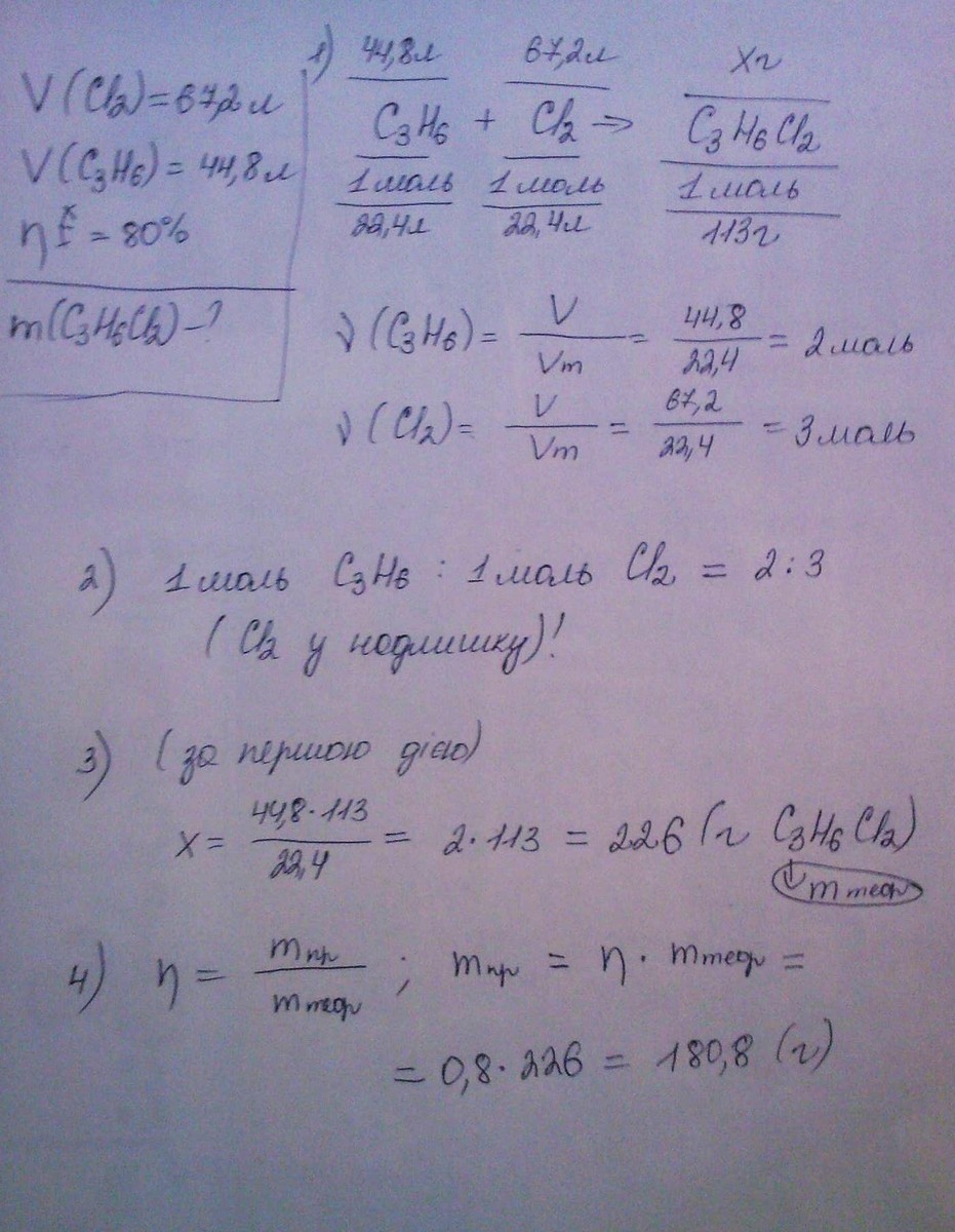 вычислите массу продукта реакции если во взаимодействие вступили 67,2 литра хлора и 44,8 литра пропена выход продукта реакции составляет 80% от теоретически возможного