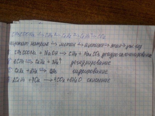 Пожалуйста!!!!!!!!Осуществите превращения CH3COONA→CH4→C2H2→C2H6→CO2 , назовите все вещества , укажите тип каждой реакции.