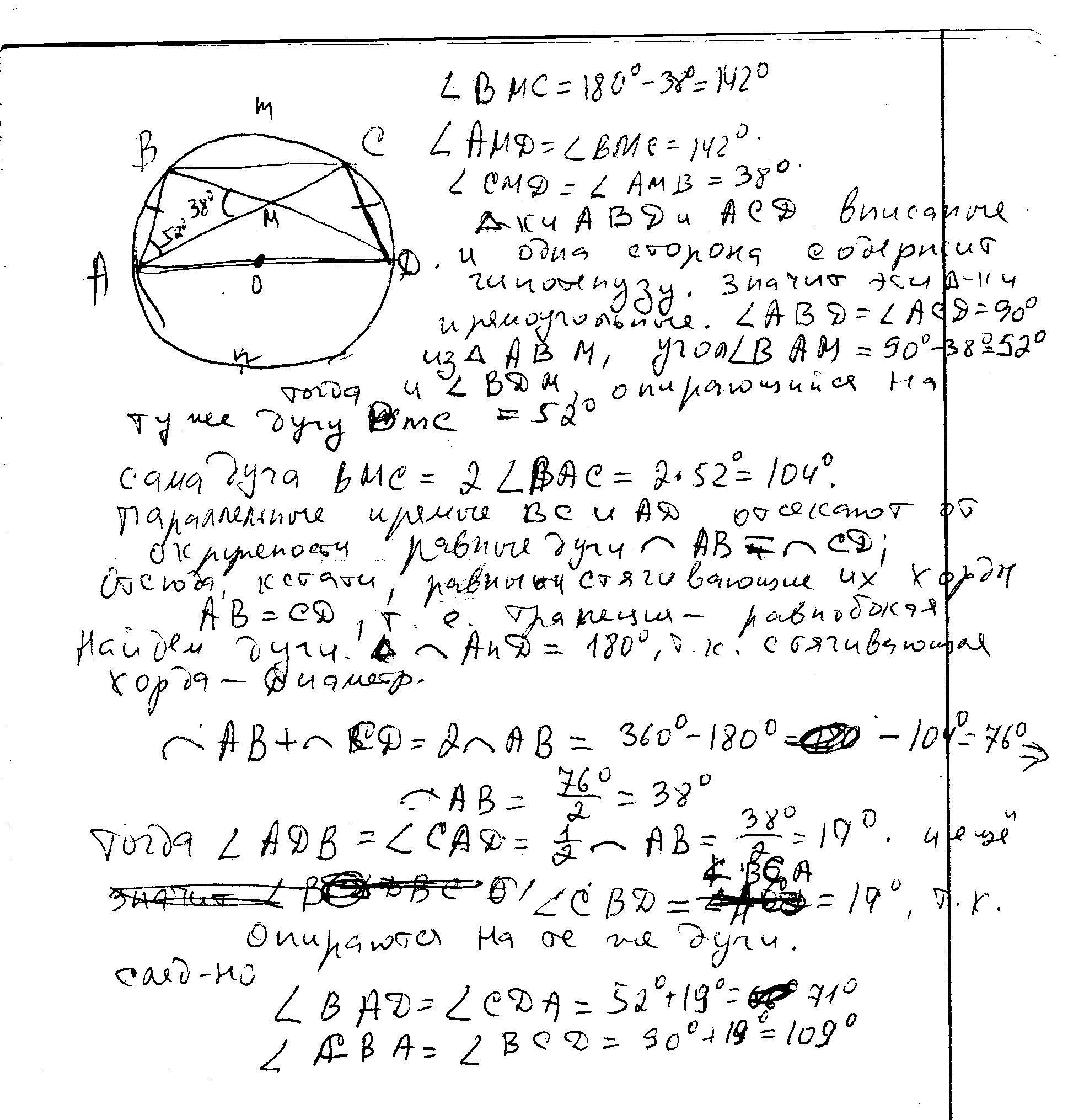 ΔABO и ΔOCD-прямоугольные⇒<BAO=<CDO=90°-38°=52°