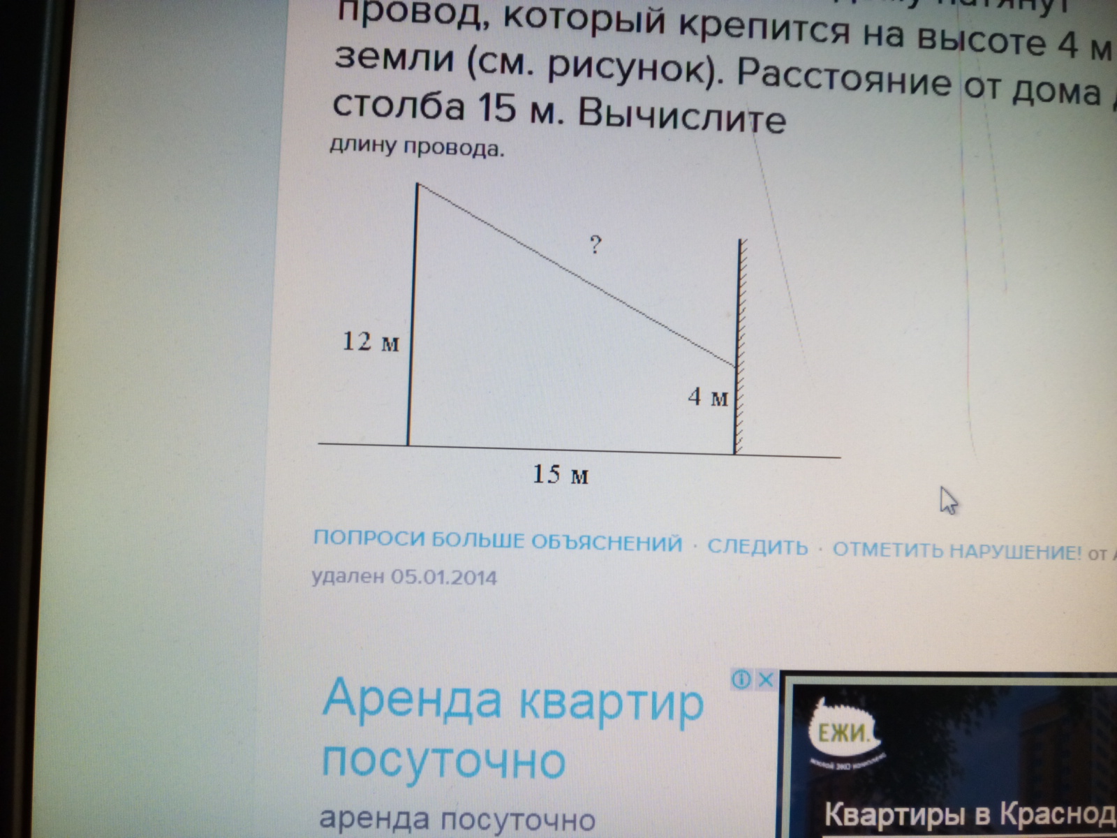 От столба 12 метров к дому натянут провод, который крепится на высоте 4 м от земли. Расстояние от столба 15 м. Вычислите длину провода. Ответ дайте в метрах