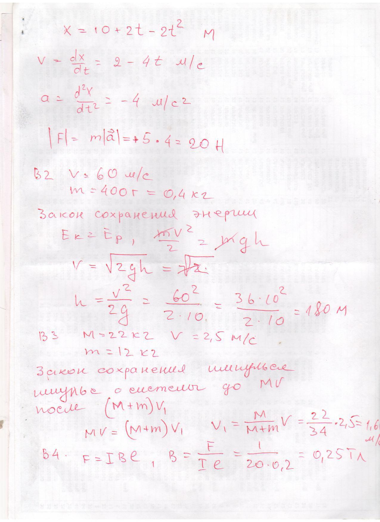 СРОЧНОО!!B1.Найдите величину силы, действующей на тело массой 5 кг, если известно,что координата тела меняется по закону х=10+2t-2t^2 и вектор силы параллелен оси ОХ.