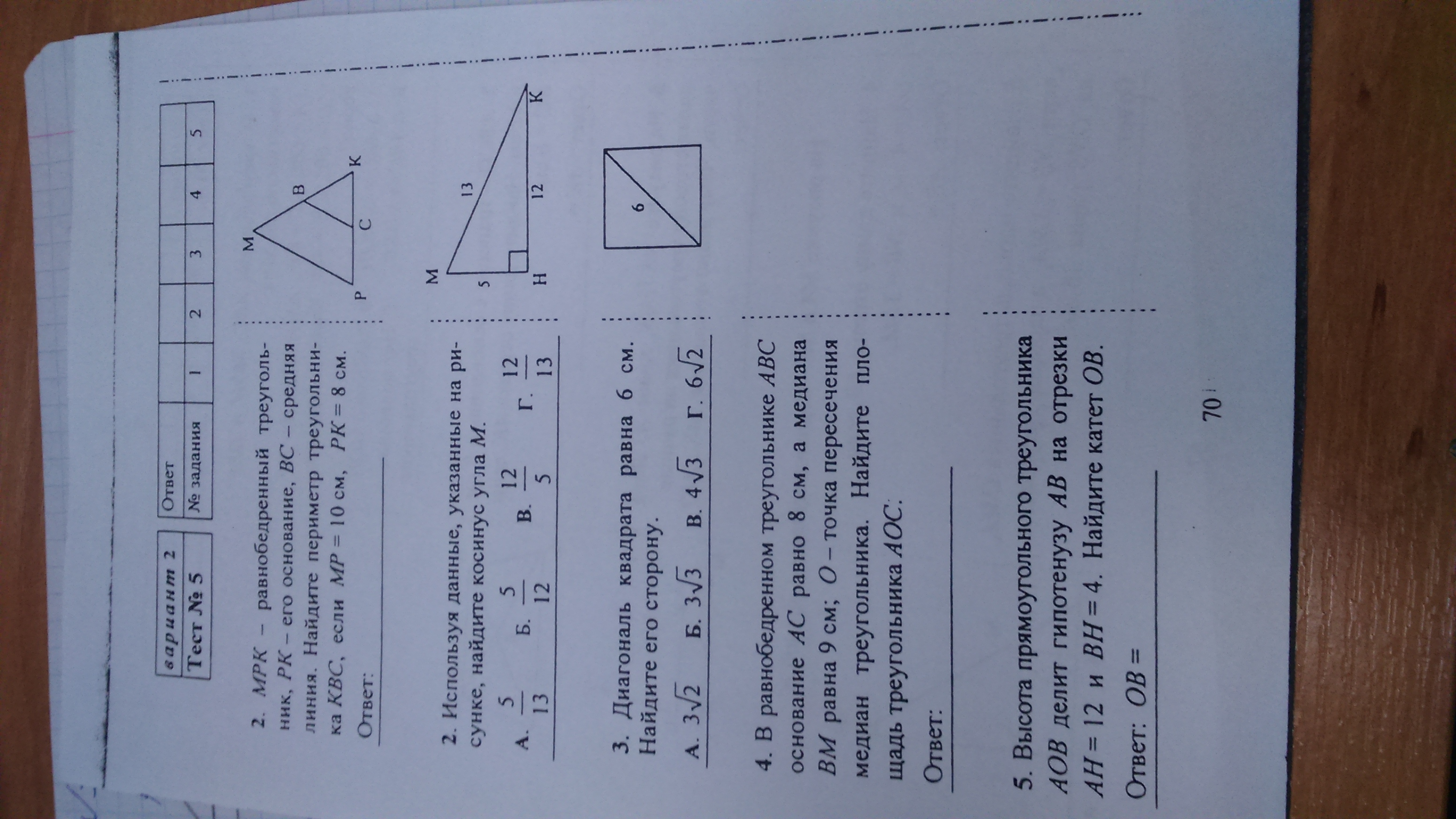 2. Медиана треугольника делит его основание пополам. значит, длина отрезка OC = 4. а так как треугольник равнобедренный, то медиана является и высотой. значит, треугольник AOC - прямоугольный. и площадь его равна 1/2*AO*OC = 1/2*9*4 = 18