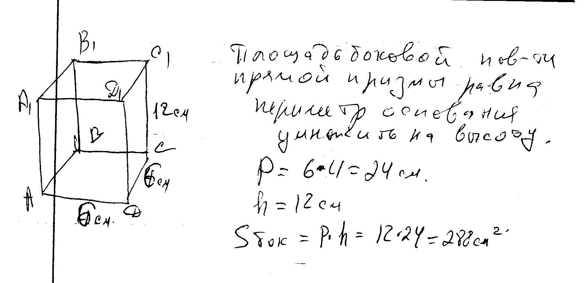 Вычислить площадь боковой поверхности прямой призмы, основанием которой является ромб со стороной 6 см, а высота призмы равна 12 см