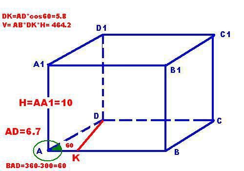 Найдите объем прямой призмы, в основании которой лежит параллелограмм со сторонами 6,7 см и 8 см, угол между этими сторонами равен 300, а высота призмы равна 10 см