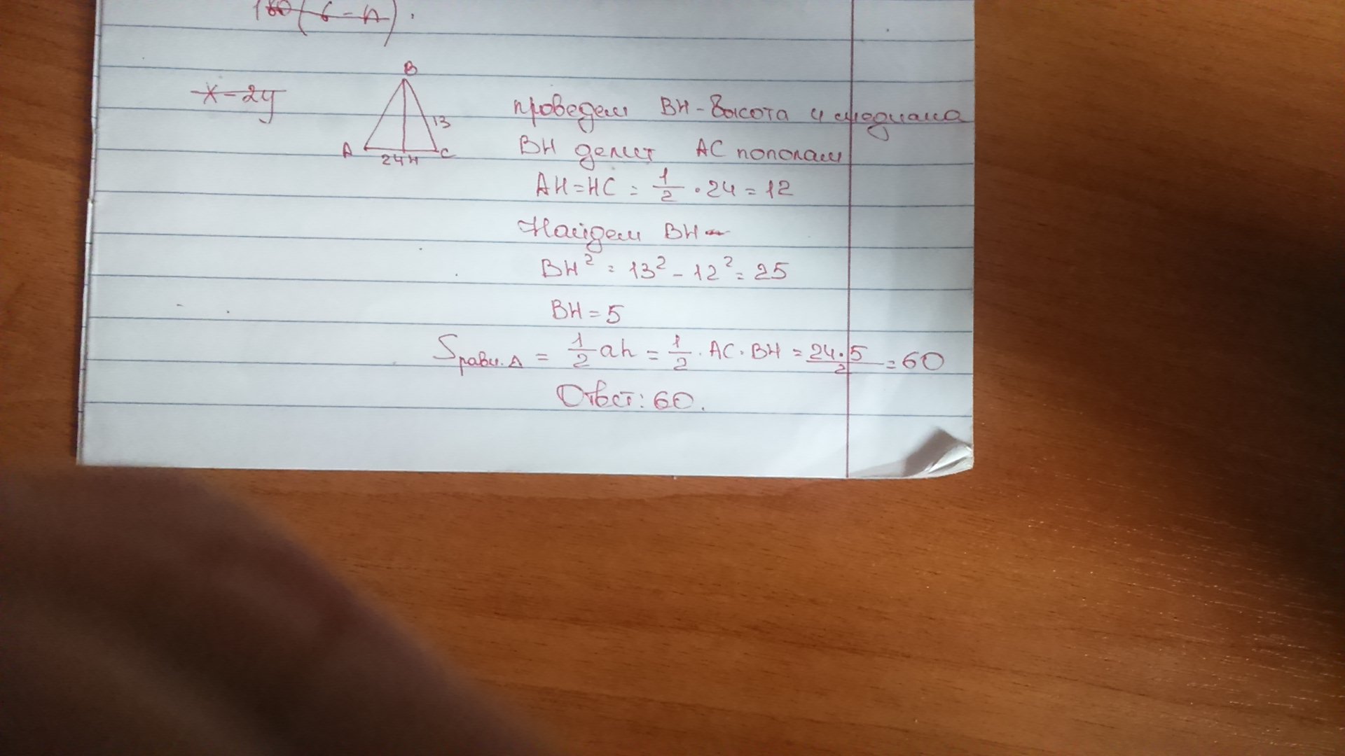 основа рівнобедреного трикутника дорівнюе 24 см бічна сторона 13 см. обчисліть площу данного трикутника