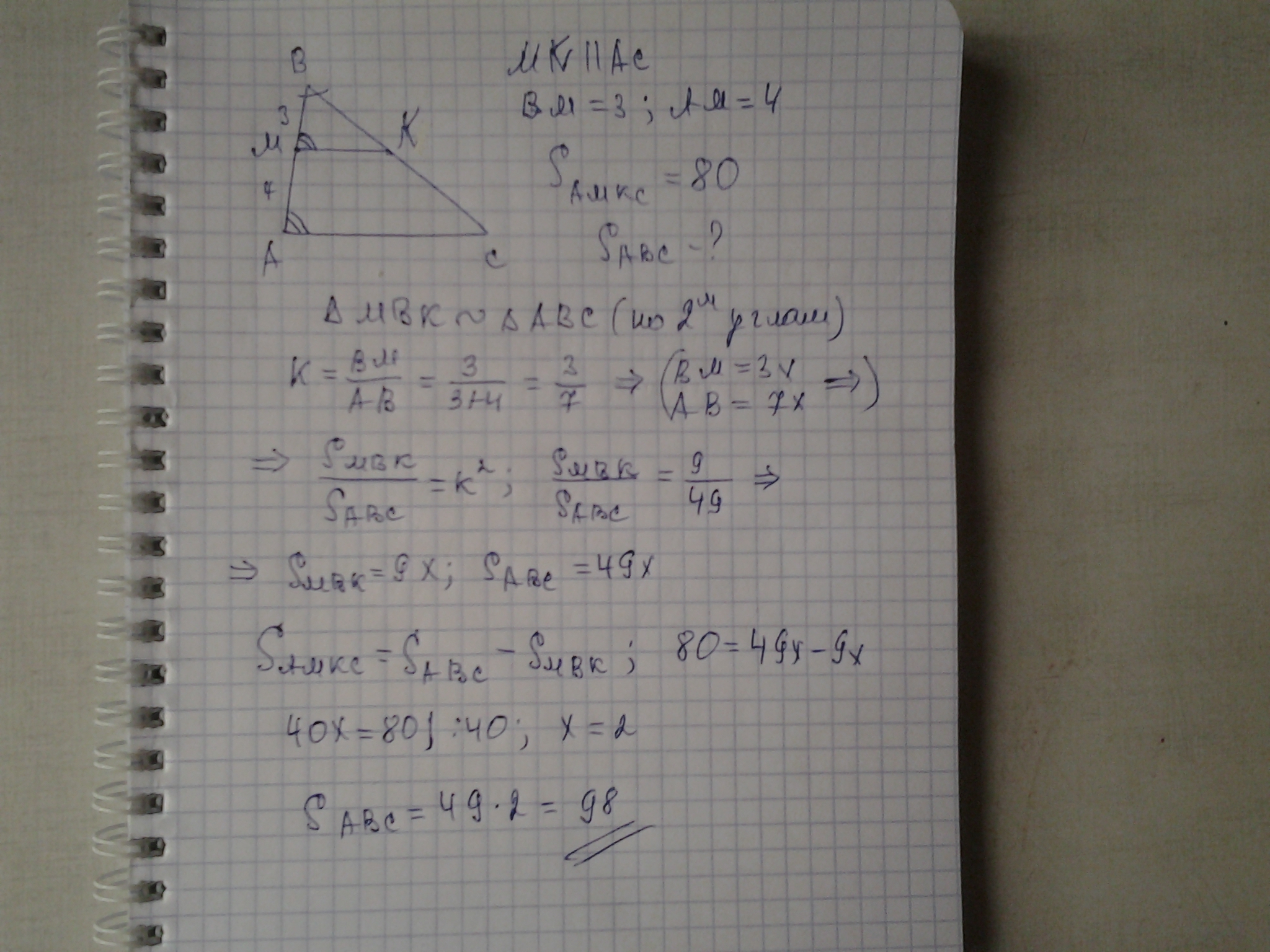 Пряма паралельна стороні AC трикутника abc перетинає його сторону AB у точці M. Знайдіть площу трикутника abc якщо BM=3см AM=4см а площа трикутника AMKC дорівнює 80см(квадратних)