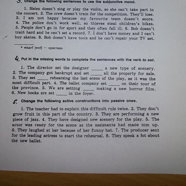 1. Учитель должен был объяснить это правило дважды. 2. Плоды не растут в этой части страны. 3. Они новую порцию джаза. 4. Они разработали новые декорации для спектакля. 5. Актер был готов к сцене,как помощники сделали его. 6. Они смеялись над ней из-за ее смешной шляпы. 7. Продюсер послал за ведущей актрисой,чтобы начать репетиции. 8. Они много говорят о новом балете.