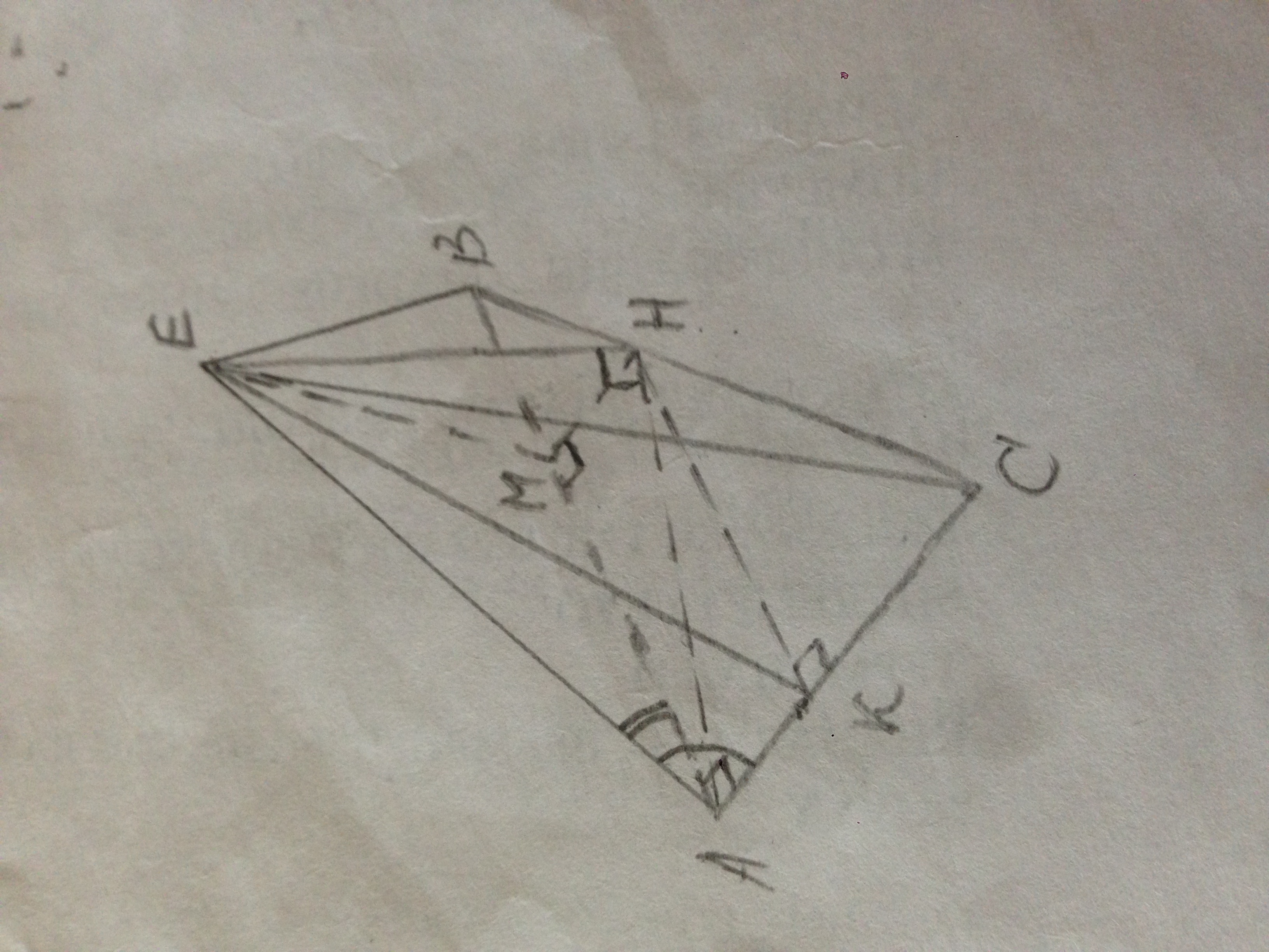 ∠ЕАС=60°, ∠ЕАВ=45°, ЕН⊥ВС, АН⊥ЕН. ЕК и ЕМ - апофемы граней ЕАС и ЕАВ соответственно. НК⊥АС, НМ⊥АВ.