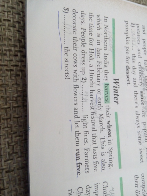 В Северной Индии cобирают пшеницу весной, в конце февраля или в начале мая. Это также время для Холи, индусский фестиваль урожая, который длится 5 дней. Люди наряжаются и разводят огонь. Фермеры украшают своих коров цветами и разрешают им свободно бегать по улицам!