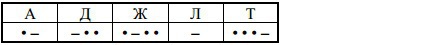 В этой радиограмме содержится последовательность букв, в которой встречаются только буквы А, Д, Ж, Л, Т. Каждая буква закодирована с помощью азбуки Морзе. Разделителей между кодами букв нет. Запишите в ответе переданную последовательность букв. Нужный фрагмент азбуки Морзе приведён ниже.