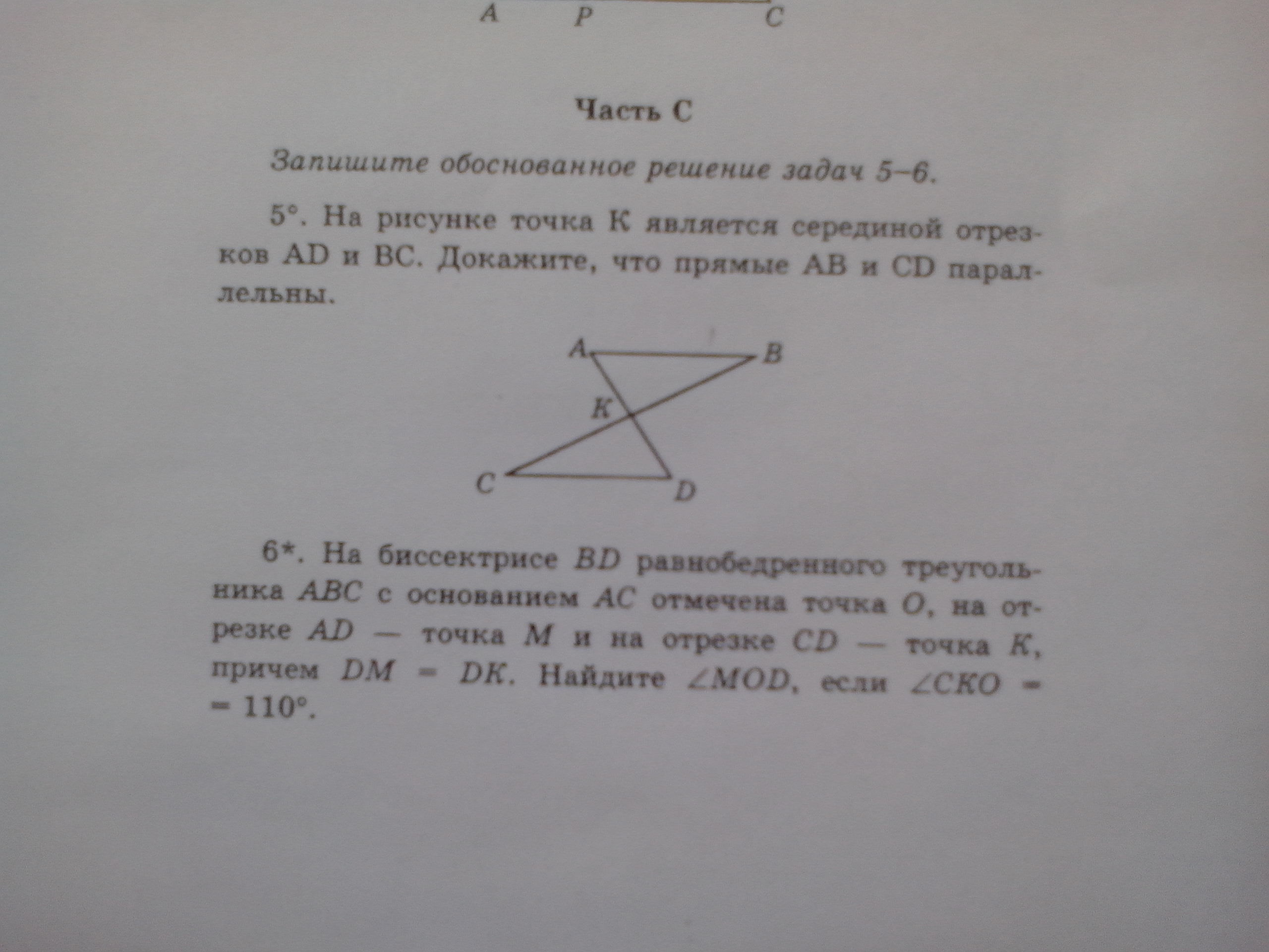 5. Рассмотри треугольники , они будут равны по 2 сторонам и углу между ними (AK=KD, BK=KC, угол АКВ= углу CKD как вертикальные)из этого следует что угол В= углу С , угол В и угол С накрест лежащие, т.к. накрест лежащие углы равны прямые параллельны
