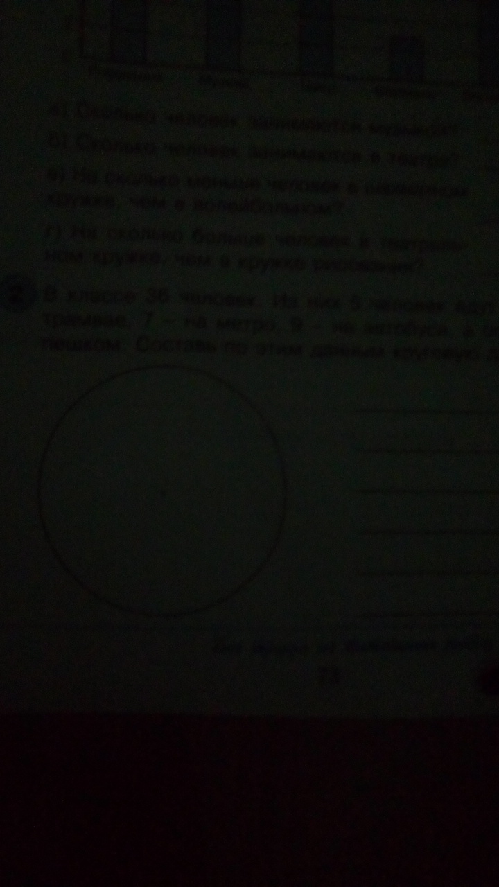 В классе 36 человек. из них 5 человек едут до школы на трамвае,7-на метро, 9-на автобусе, а остальные идут пешком. Составь во этим данным круговую диаграмму!! ПОМОГИТЕ!