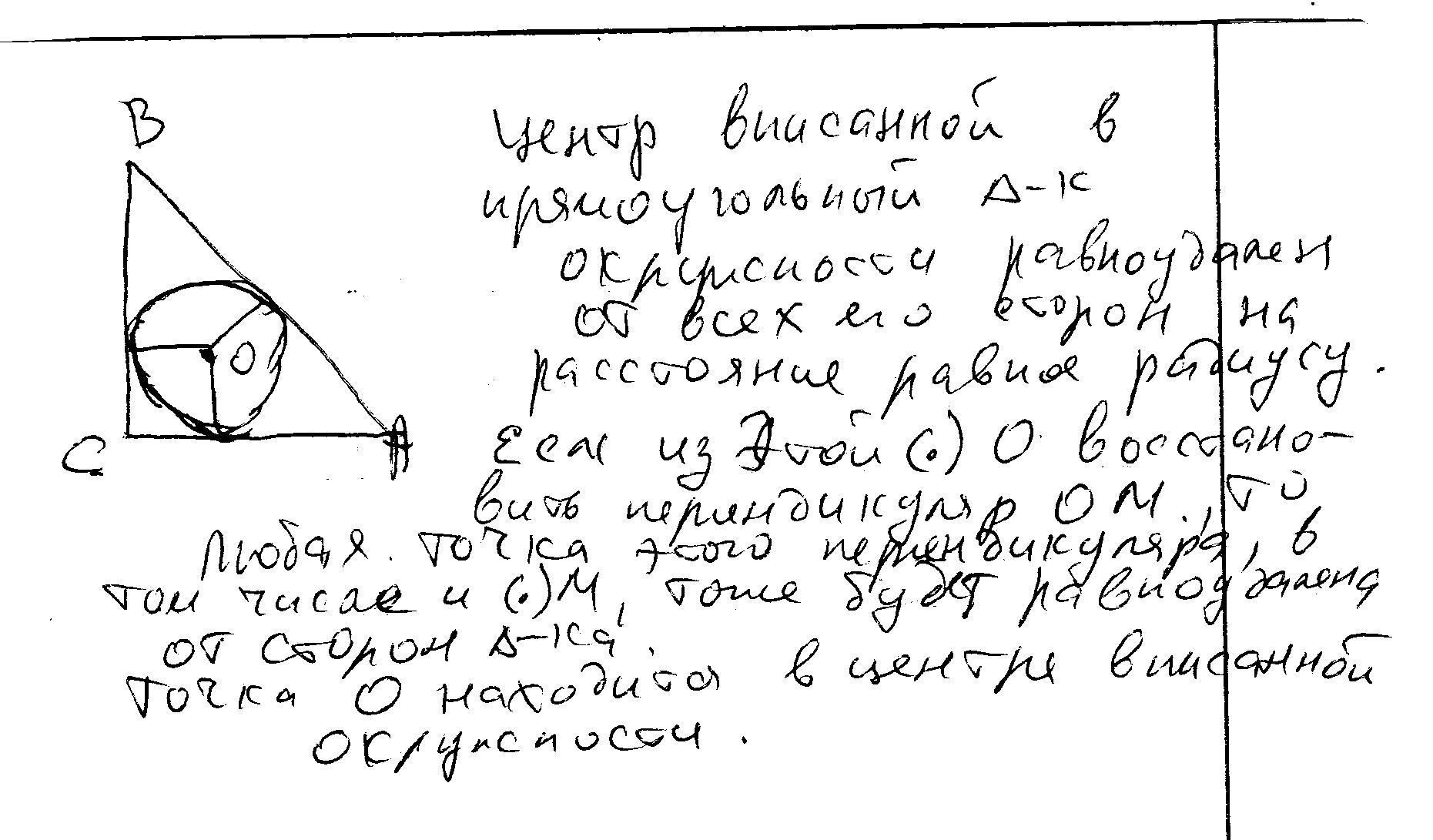 Точка М рівновіддалена від усіх сторін прямокутного трикутника ,МО-перпендикуляр до площини цього трикутника.Де розташована точка О?Помогите пожалуйста нужно срочно,спасибо зарание