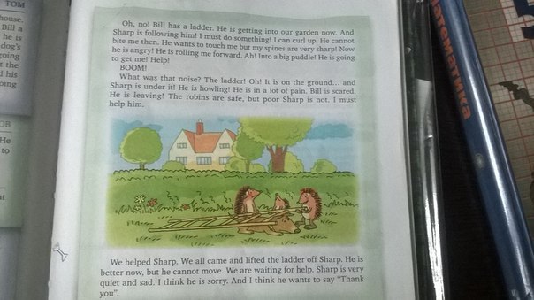 О, нет! У Билла лестница.Теперь он лезет к нам в сад. А Шарп за ним! Я должен предпринять что-либо. я могу увернуться клубом. Тогда он не сможет укусить меня. Он захочет прикоснуться ко мне, но мои иголки очень острые! Теперь он зол! Он катит меня вперед. Ах! В большую лужу. Он собирается схватить меня! Помогите!