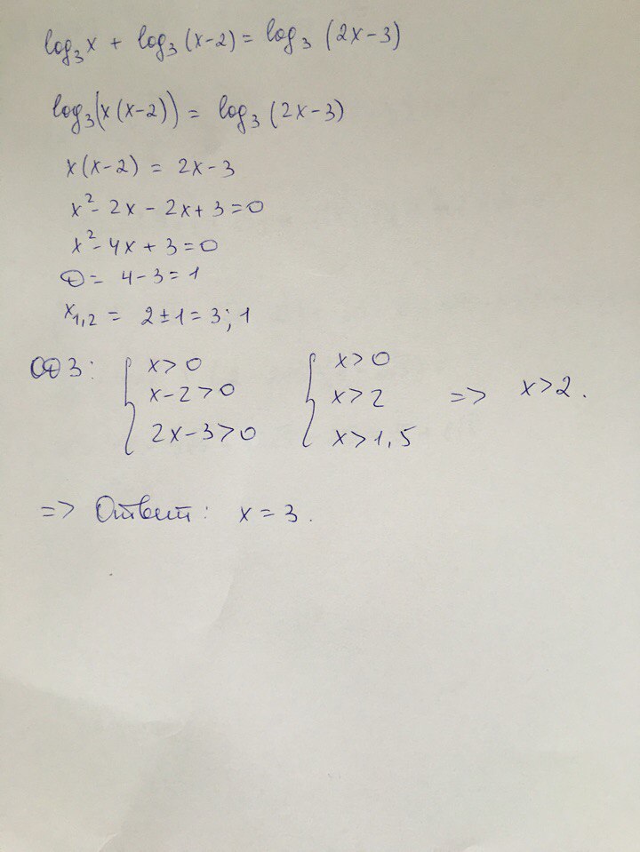 log(3)[x(x-2)]=log(3)(2x-3)