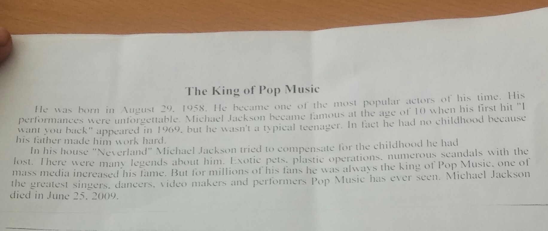 Он родился 29 августа 1958 года. Он стал одним из самых популярных артистов(актёров) своего времени. Его выступления были незабываемыми.Майкл Джексон стал знаменитым в возрасте десяти лет, когда его первый хит " Я хочу, чтобы ты вернулась" появился в 1969 году.Он не был типичным подростком. Фактически у него не было детства, потому что его отец заставлял Майкла много работать.