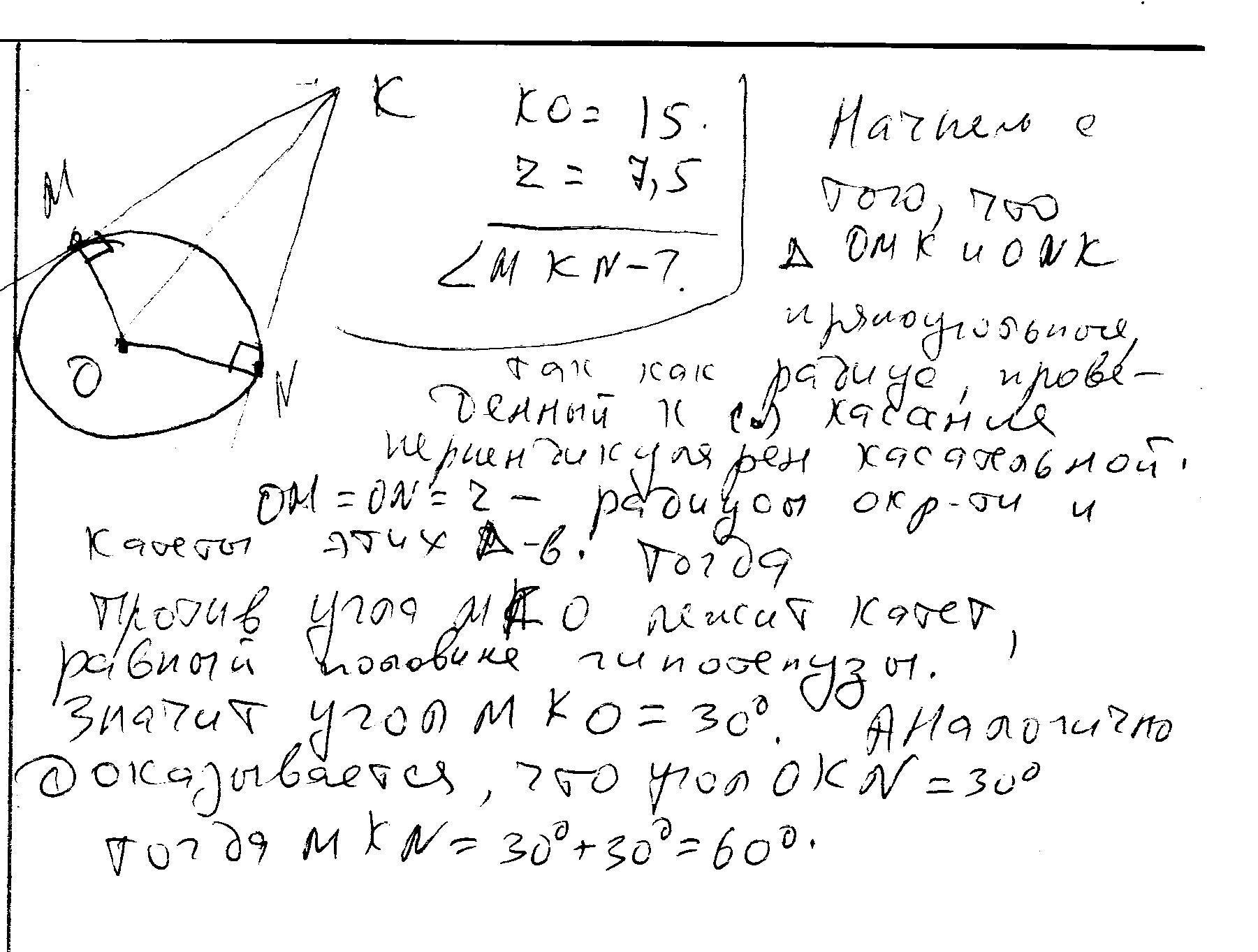 из точки K, не лежащей на окружности с центром O проведены 2 касательные, они пересекаются с окружностью в точках M и N. Расстояние от K до центра O равно 15 см, а радиус окружности равен 7,5 см. Найти чему равен угол MKN
