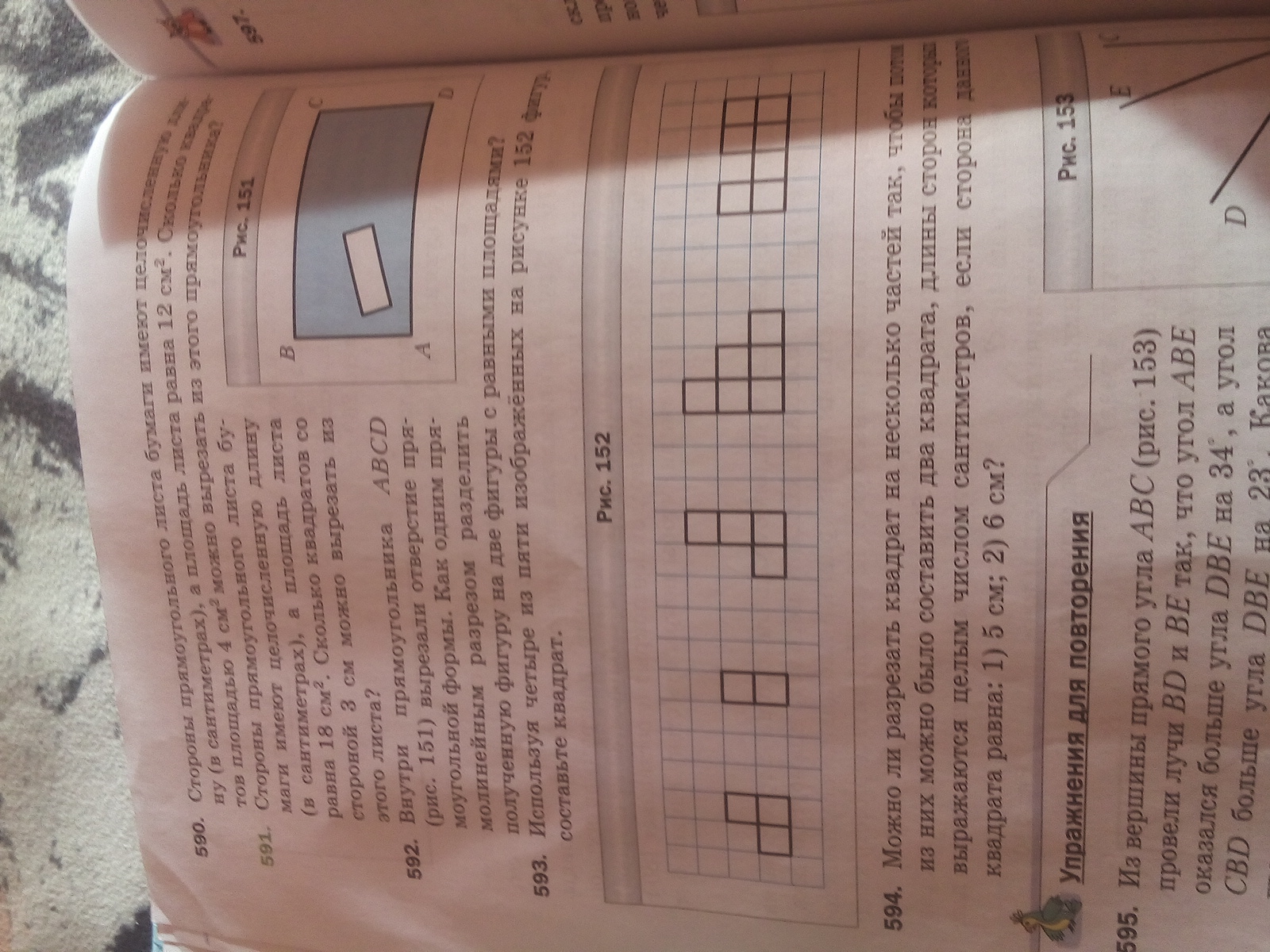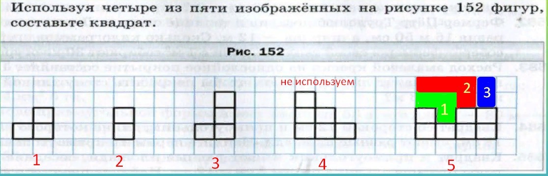 3+2+4+6+7=22 клеток.Ближаещий полный квадрат 16=4^2.ЭТО означает, что сторона квадрата будет 4 клетки.Осталось на последную фигуру (у него нижняя сторона 4 клетки)"собирать"не хватающий 16-7=9 клеток.А это 3+2+4=9, то есть 1-ая,2-ая и 3-яя фигура.Собираем: