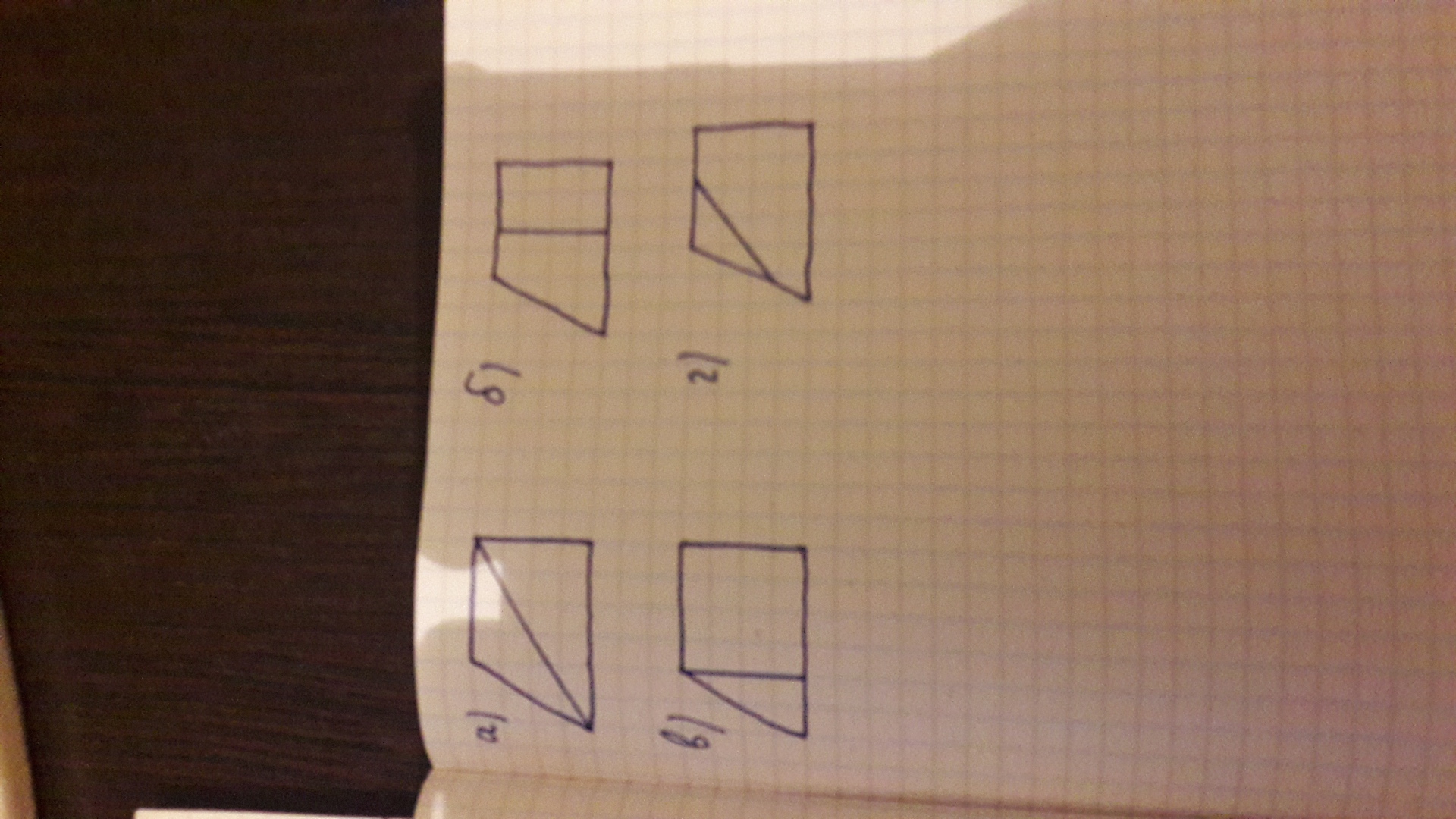 начерти в тетради такой четырёхугольник, как на рисунке.Проведи один отрезок так, чтобы он разбил четырёхугольник: а) на 2 треугольника; б) на 2 четырёхугольника; в) на треугольник и четырёхугольник; г) на треугольник и пятиугольник.