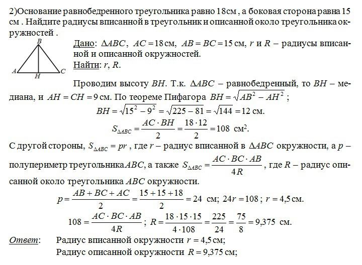 2)Основание равнобедренного треугольника равно 18см , а боковая сторона равна 15 см . Найдите радиусы вписанной в треугольник и описанной около треугольника окружностей .