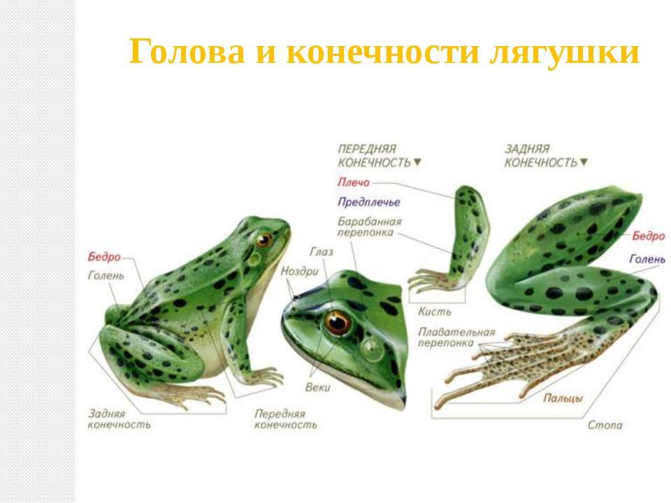 У лягушек тело уплощено, разделено на голову, туловище, конечности. Голова плавно переходит в туловище Конечности парные, пятипалые. Задние длиннее передних. Есть плавательные перепонки между пальцами. На голове есть парные глаза и ноздри. Глаза защищены подвижными веками. За глазами можно рассмотреть два небольших кружка. Это уши лягушки, представленные внутренним ухом и барабанной перепонкой сверху. Кожа тонкая, с большим количеством желез. У взрослых особей лягушек редуцирован хвост. Спинка окрашена темнее и ярче, чем живот. Живот белесый с темными пятнами.
