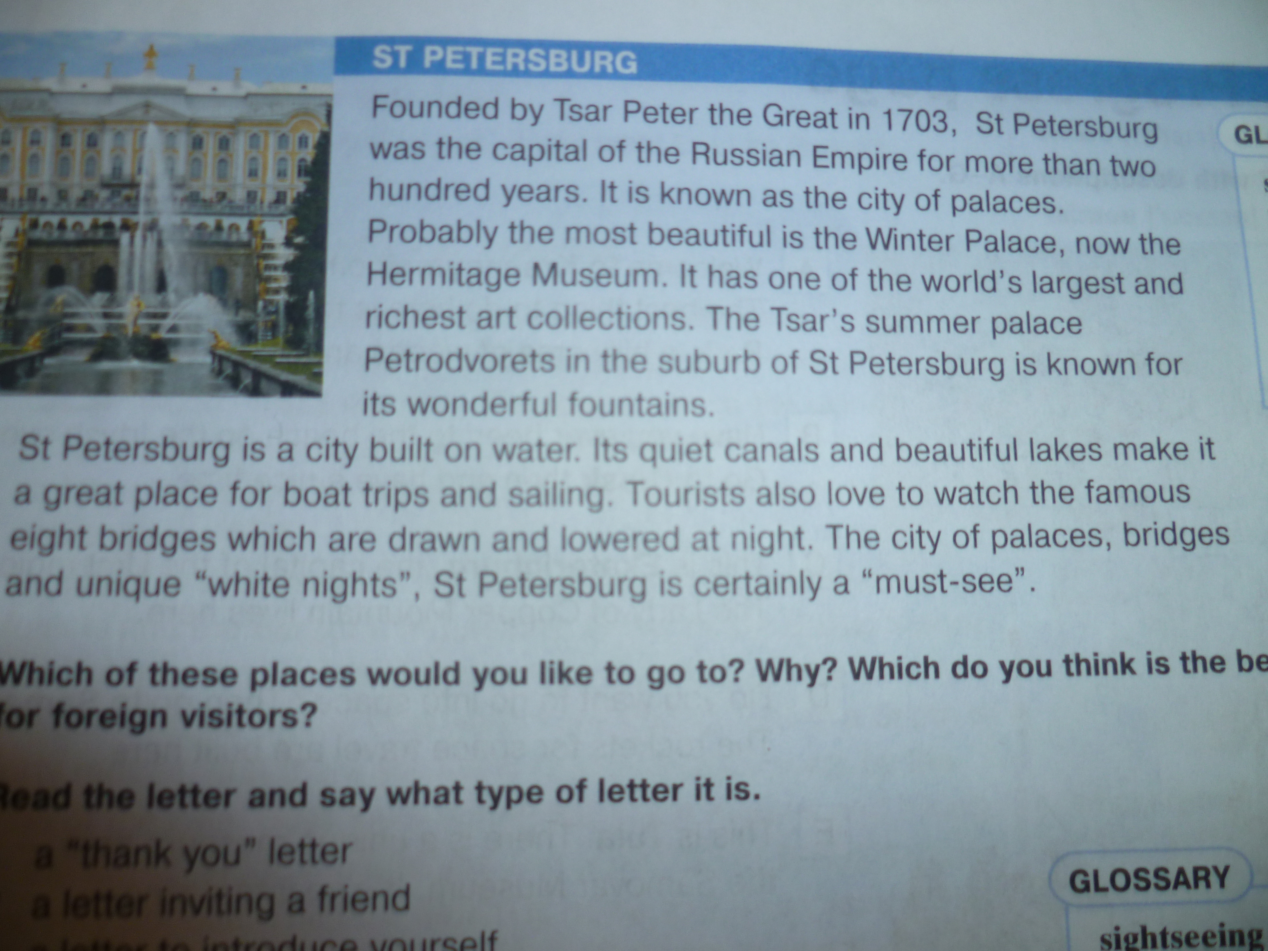 Санкт-Петербург. Основанный царем Петром Великим в 1703 году, Санкт-Петербург был столицей Российской Империи более 200 лет. Город известен как город дворцов. Возможно, самый красивый-Зимний Дворец, который теперь является Эрмитажем.Там самая богатая и большая художественная коллекция. Летний царский дворец Петергоф расположен недалеко от Санкт-Петербурга и известен своими фонтанами.