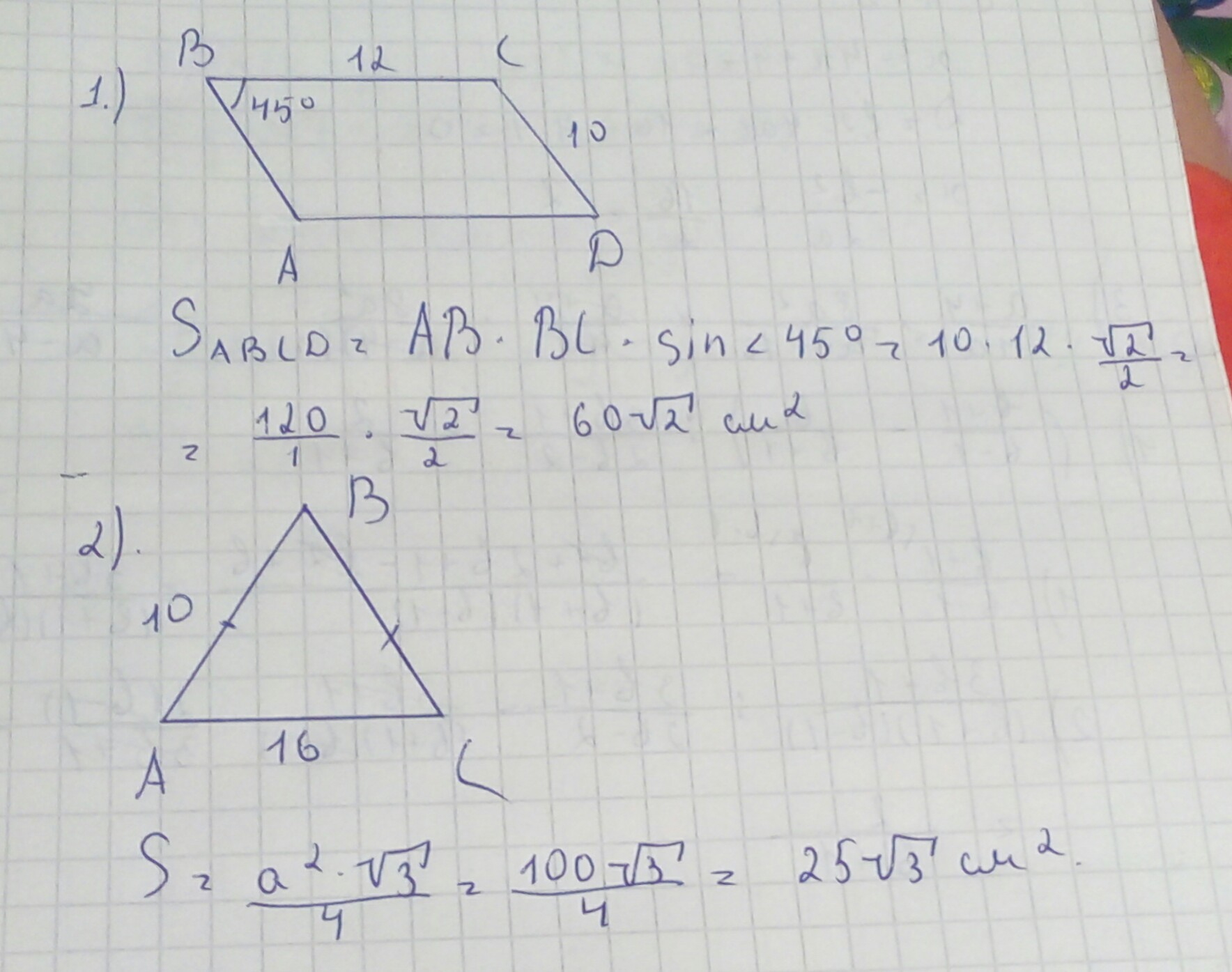 Пожалуйста помогите 1) стороны параллелограмма равны 10 см и 12, а его острый угол равен 45 градусов. Найдите площадь параллелограмма 2) Найдите площадь равнобедренного треугольника , основание которого равна 16 см, а боковая сторона - 10 см.