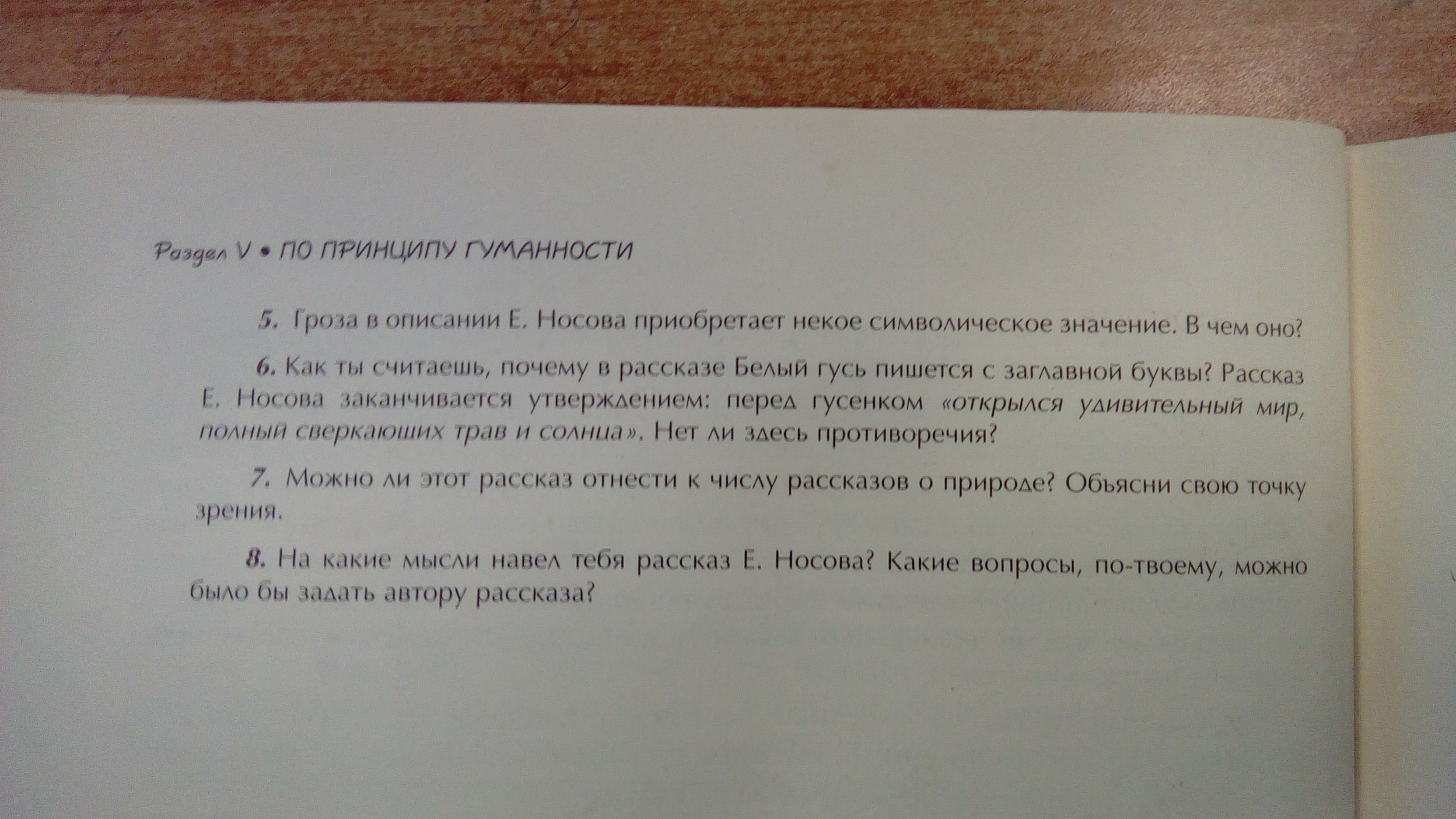 5) гроза в описании Носова приобретает символическое значение, потому что гусь погиб именно из-за этого природного явления. Налетел сильный вихрь, туча прорвалась и обрушилась холодным косым ливнем, посыпался град. Словно зло ворвалось в светлый мир Белого гуся.