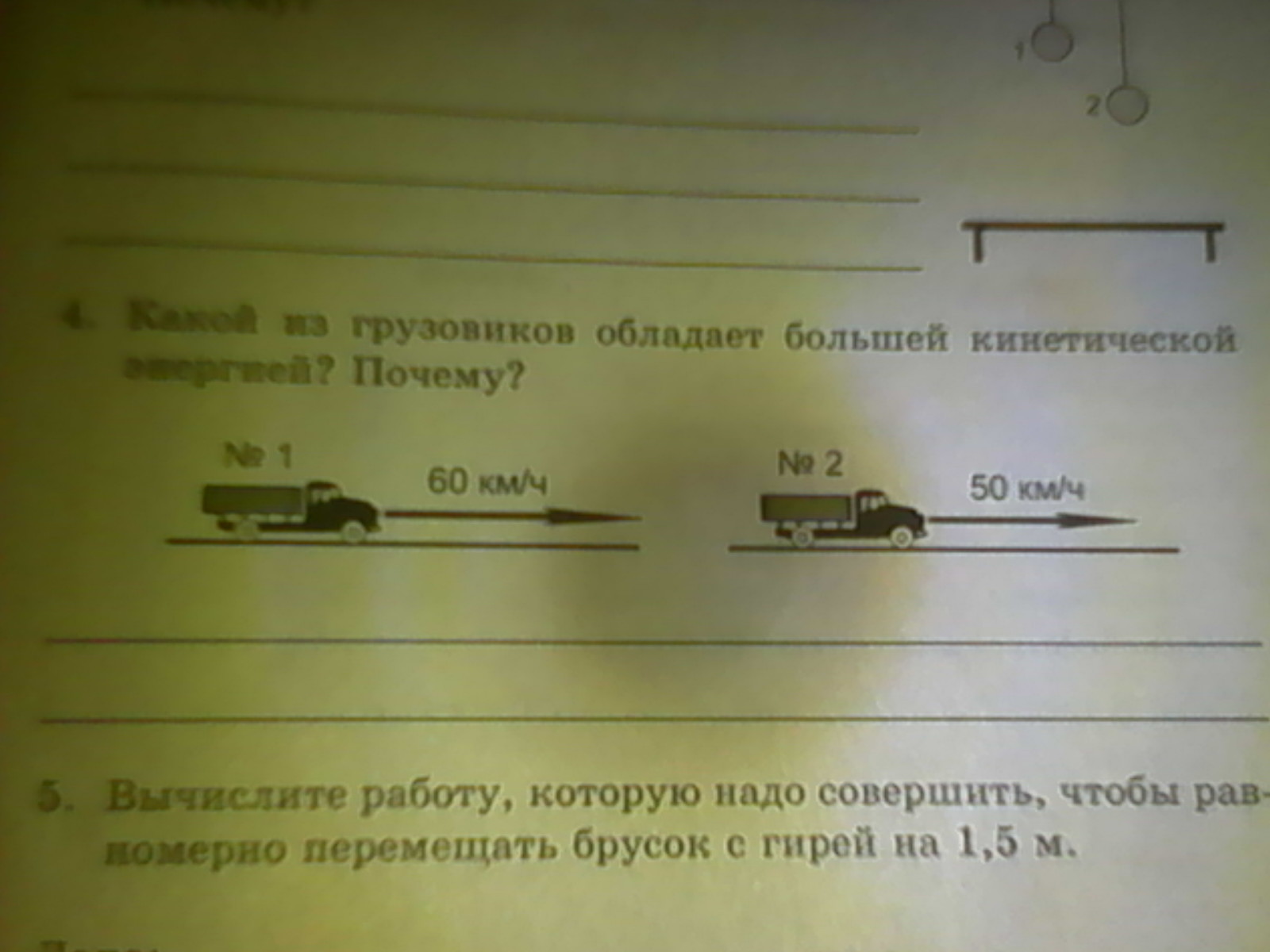 1 грузовик, так как скорость тела влияет на кинетическую энергию. чем больше скорость тем больше кинетическая энергия