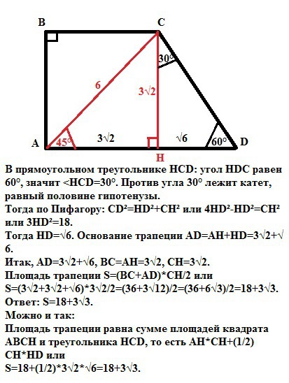Тогда HD=√6. Основание трапеции АD=АН+HD=3√2+√6.