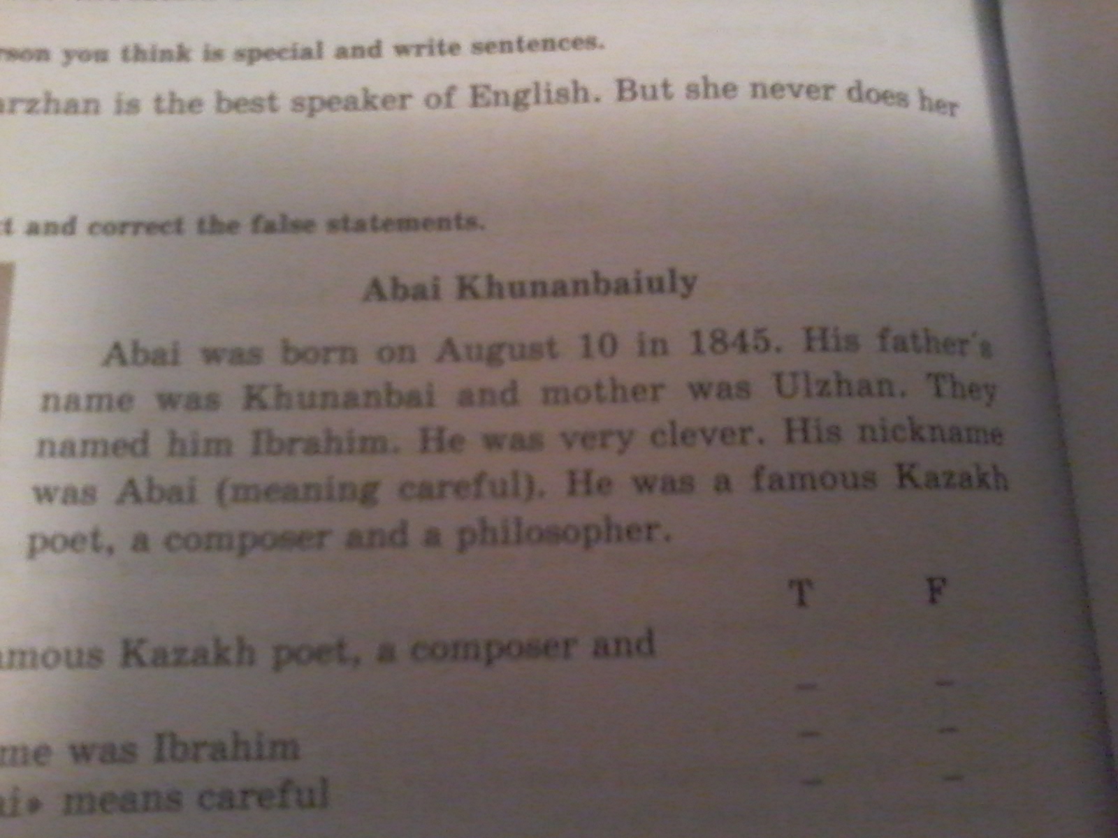 Абай родился 10 августа в1845. Имя его отца ю.ш. Кунанбай и мать была Улжан. Они назвали его Ибрагимом. Он был очень умен. Его прозвище Абай . Он был известный казахский поэт, композитор и философ