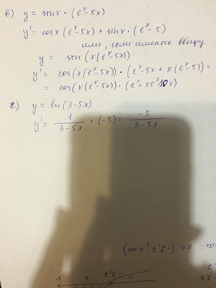 таблица производных просто, нагуглите, там элементарные преобразования. в первом случае производная от произведения функций: (uv)'=u'v+uv'; во втором случае просто производная от логарифма