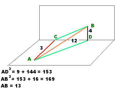 1)Из точек А и В которые лежат в перпендикулярных плоскостях,проведены перпендикуляры АС и BD к прямой пересечения плоскостей.AC=3,BD=4,Cd=12.Найдите длину отрезка AB