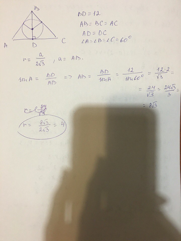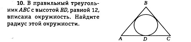 Радиус окружности вписанной в правильный треугольник равен 1/3 его высоты.