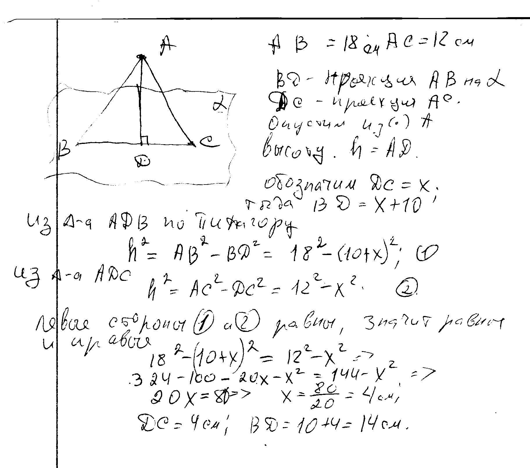 з точки а до площини альфа проведено похилі ав і ас довжиною 12 см і 18 см. Знайдіть довжини проекції похилих, якщо одна з них на 10см більше другої