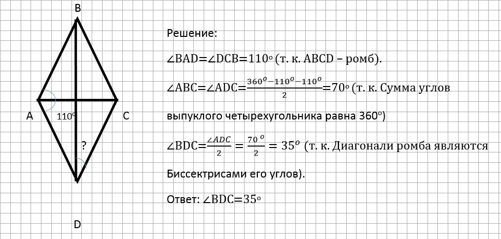 Один из углов ромба равен 110. Найдите угол между диагональю и стороной ромба. В ответе укажите меньший из них. Ответ дайте в градусах