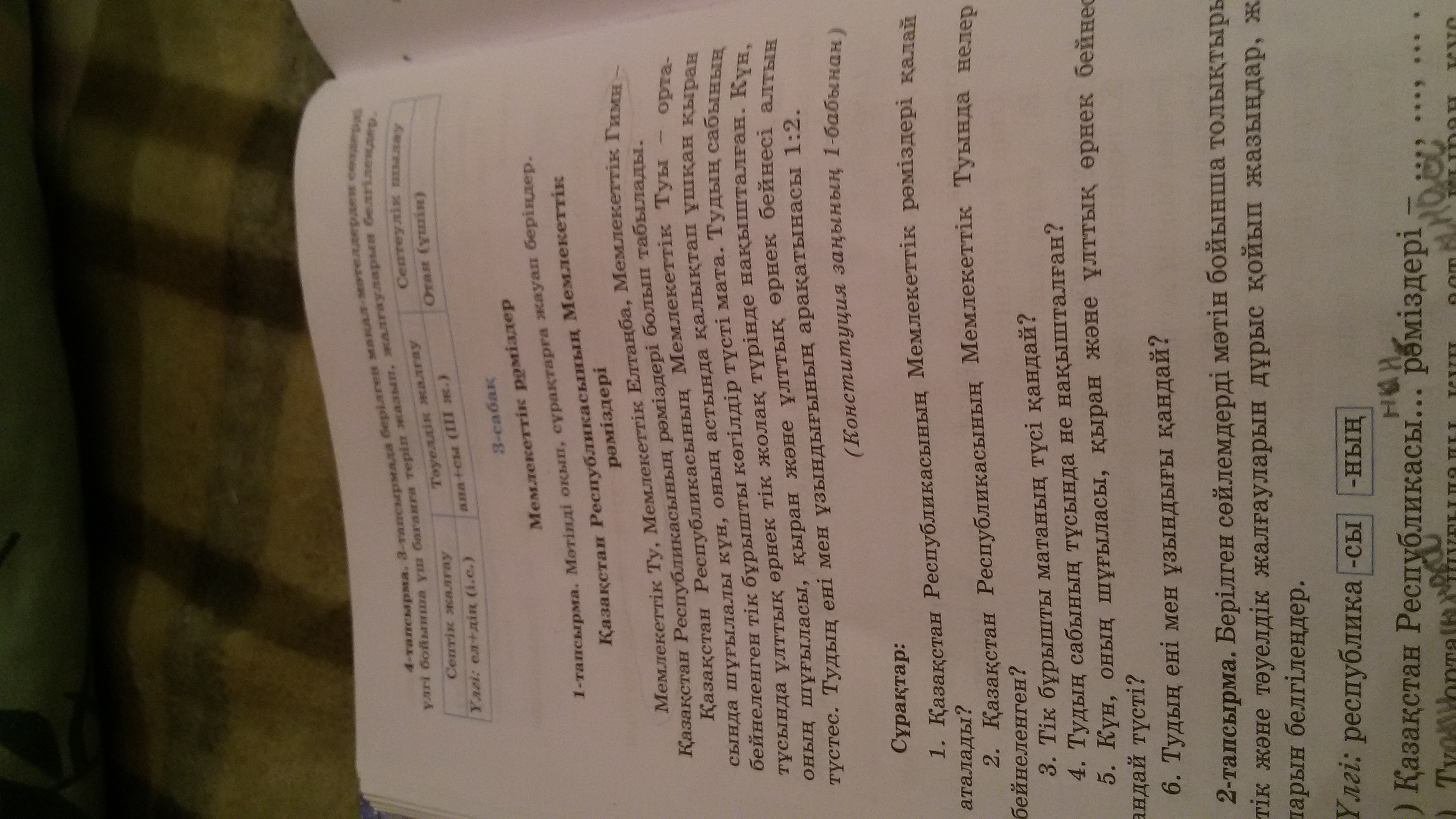 государственный флаг, государственный герб, государственный гимн- являются символами республики Казахстан. Государственный флаг республики Казахстан- это ткань голубого цвета, прямоугольной формы, в середине которой изображено лучистое солнце, под ним летящий орёл. в стороне рукояти флага изображена полоса с национальным орнаментом. солнце, орел и орнамент нарисованы золотым цветом. соотнршение длины и ширины флага - один к двум