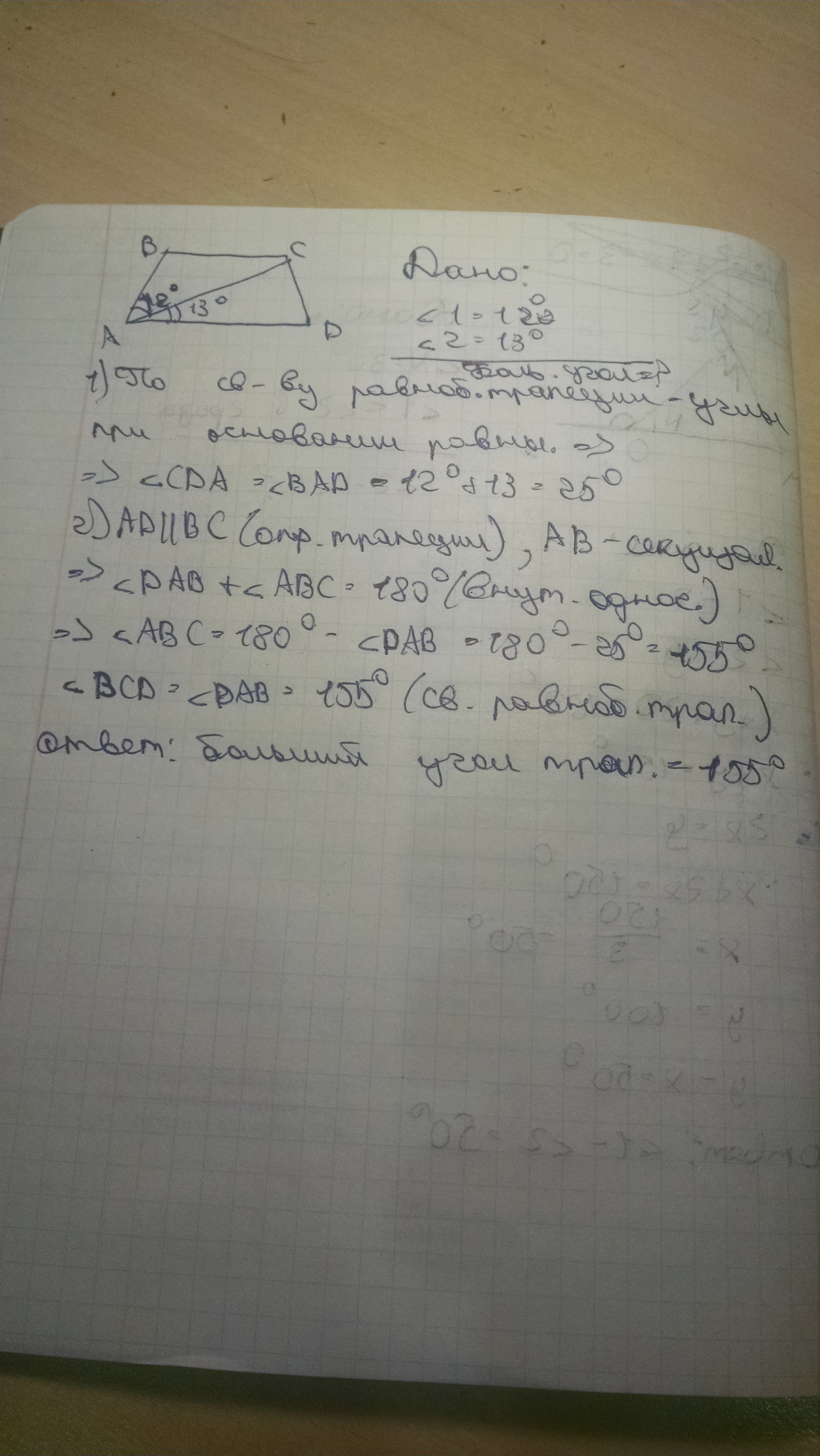 найдите больший угол равнобедренной трапеции ABCD если диагональ AC образует с основанием AD и боковой стороной AB углы равны 12 и 13 соответственно))ответ дайте в градусах)
