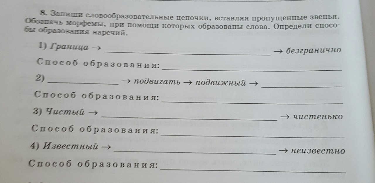 1) Граница→безграничный (приставка (¬)БЕЗ, суффикс (∧) Н)→безгранично (приставка (¬)БЕЗ, суффикс (∧) Н, О)