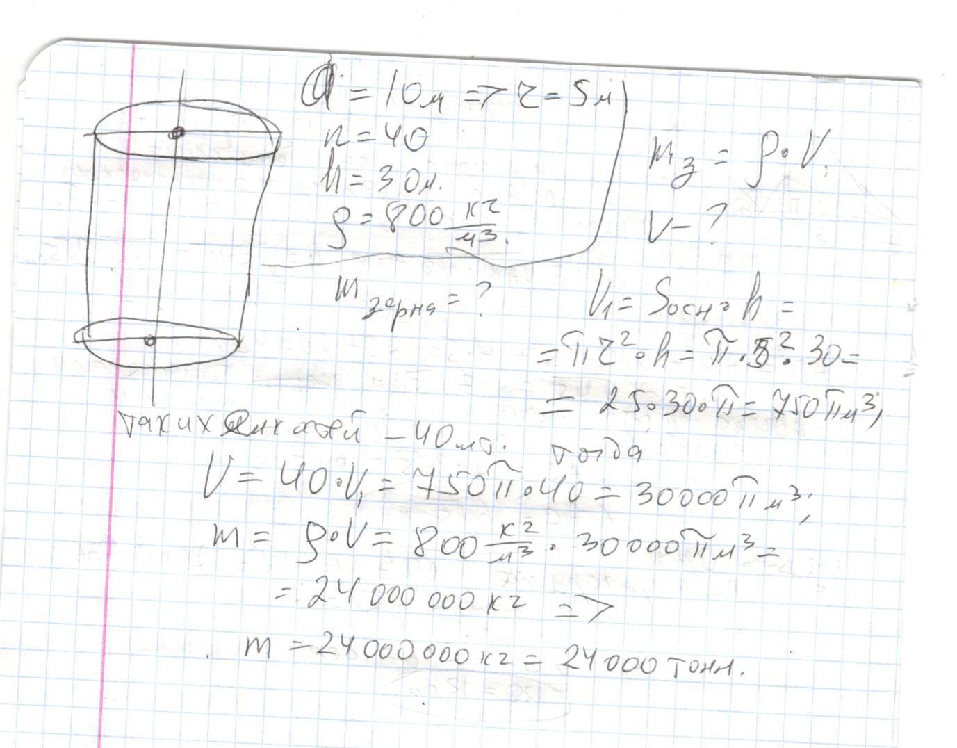 Вычислите запас зерна в элеваторе, имеющем 40 цилиндрических резервуаров.(Размеры резервуара: высота- 30м, внутренний диаметр- 10м, плотность зерна- 800кг/метров кубических)