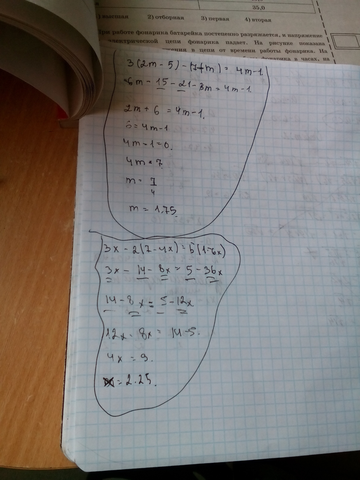 1) 3(2m-5)-(7-m)=4m-1