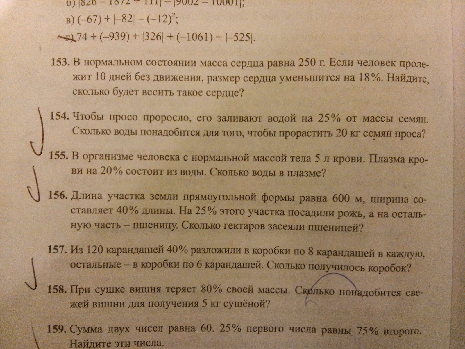 №156 40%=0,4 1)600*0,4=240(м)-ширина уч-ка 2)600*240=144000(кв.м)-площадь уч-ка 3)144000*0,25=36000(кв.м)-засеяно рожью 4)144000-36000=108000(кв.м)=10,8га -засеяно пшеницей №157 1)100-80=20%=0,2 2)5:0,2=25 (кг)-понадобится свежей вишни