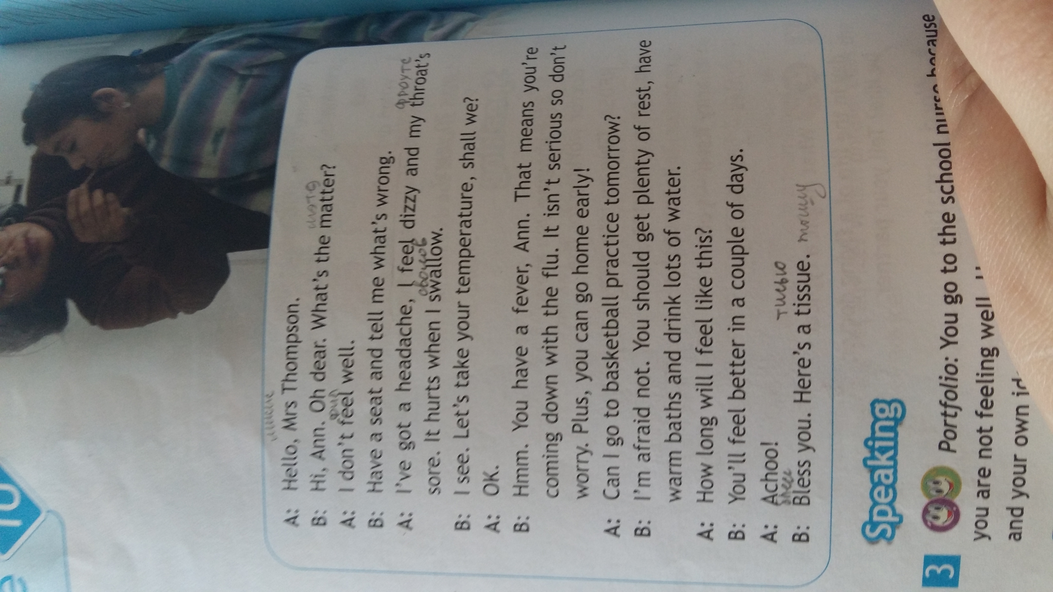 B: Хм. У Вас есть лихорадка, Энн. Это означает, что Вы снижаетесь с гриппом. Это не серьезно, так не волнуйтесь. Плюс, Вы можете пойти домой рано!