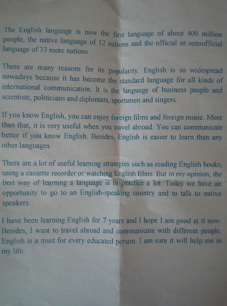 Я учу английский около 7 лет и надеюсь, что я хорош в этом. Кроме того, я хочу путешествовать и общаться с различными людьми. Знание английского языка обязательно для каждого образованного человека. Я уверен, что это поможет мне в моей жизни ( Я бы сказал в моей будущей карьере)